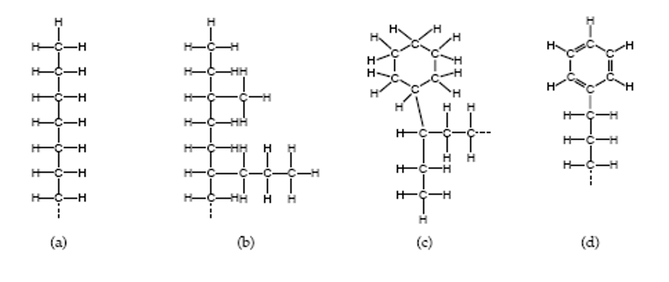 有兩種石油常用作潤(rùn)滑劑的原料,即石蠟油和環(huán)烷油,其基本化學(xué)結(jié)構(gòu)如下圖所示,a和b為石蠟,c為萘,d為芳烴。石蠟是一種極好的潤(rùn)滑劑,它很滑,在高溫下也很穩(wěn)定,但石蠟在低溫下會(huì)變成固體,此外,石蠟在氧化時(shí)會(huì)產(chǎn)生少量的殘留物,這些殘留物即堅(jiān)硬且粘稠,從而失去潤(rùn)滑效果,出于這個(gè)原因,大多數(shù)工業(yè)和運(yùn)輸潤(rùn)滑劑使用鏈烷烴油。