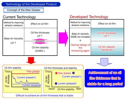 針對(duì)這種情況,NSK成功開發(fā)出一種新的潤滑脂,該潤滑脂即使在惡劣條件下也能保持滾子與內(nèi)外圈之間的油膜,與當(dāng)前產(chǎn)品相比,軸承滾道表面的耐磨性水平提高約10倍,從而延長軸承使用壽命。