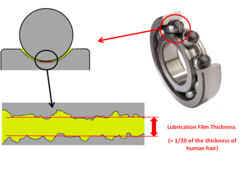 軸承和其他旋轉(zhuǎn)部件需要良好的潤滑油膜厚度,以分離金屬部件并減少磨損,然而,產(chǎn)生良好的膜厚度是一個復(fù)雜的化學(xué)機制,這取決于許多因素。在具有良好平均潤滑膜厚度的軸承中,金屬表面是分離的,并且這種分離或膜的平均厚度非常小,大約是一縷頭發(fā)厚度的二十分之一,如上圖所示。