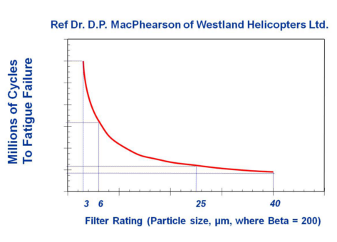 顆粒污染對軸承壽命的影響得到了MacPhearson博士開展的一項研究項目的支持,該項目研究了過濾器額定值與數(shù)百萬次軸承循環(huán)疲勞失效之間的關(guān)系,如上圖所示,污染水平越低,軸承壽命越長。
